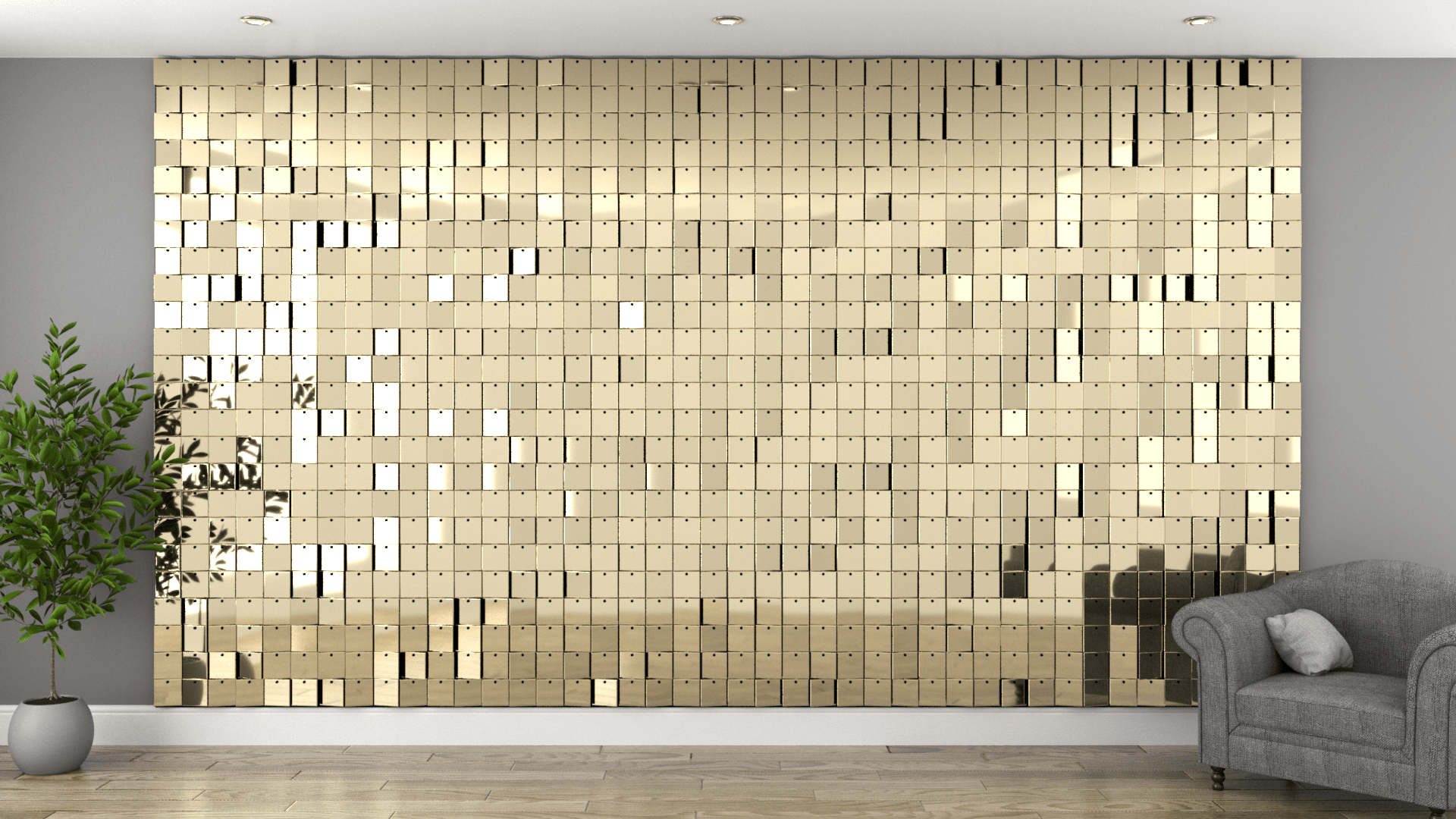 Frei hängende Fliesen, die ein atemberaubendes bewegliches Wandsystem schaffen. Immer im Wandel.