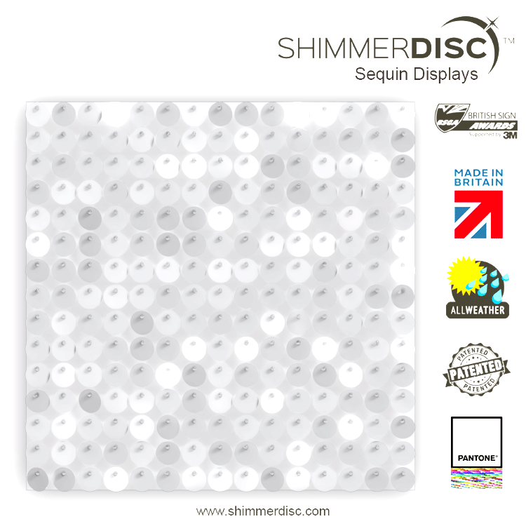 “प्रत्येक डिस्क को व्यक्तिगत रूप से पिक्सेल परफेक्ट इमेज बनाने के लिए प्रिंट किया जाता है। डिजाइनरों के पास गहराई जोड़ने के लिए सफेद सहित एक पूर्ण रंग का पैलेट होता है, जो एक सादे पन्नी सेक्विन को जादू के पिक्सेल में बदल देता है। प्रत्येक मॉड्यूल रिवर्स प्रिंटेड और वैकल्पिक रूप से स्पष्ट है। समाप्त प्रभाव एक प्रदर्शन प्रस्तुत करता है जो लगभग 3D और सबसे आश्चर्यजनक गति के साथ दिखता है। शिमरडिस्क, आपके डिजाइन में एनिमेटेड चमक जोड़ता है।