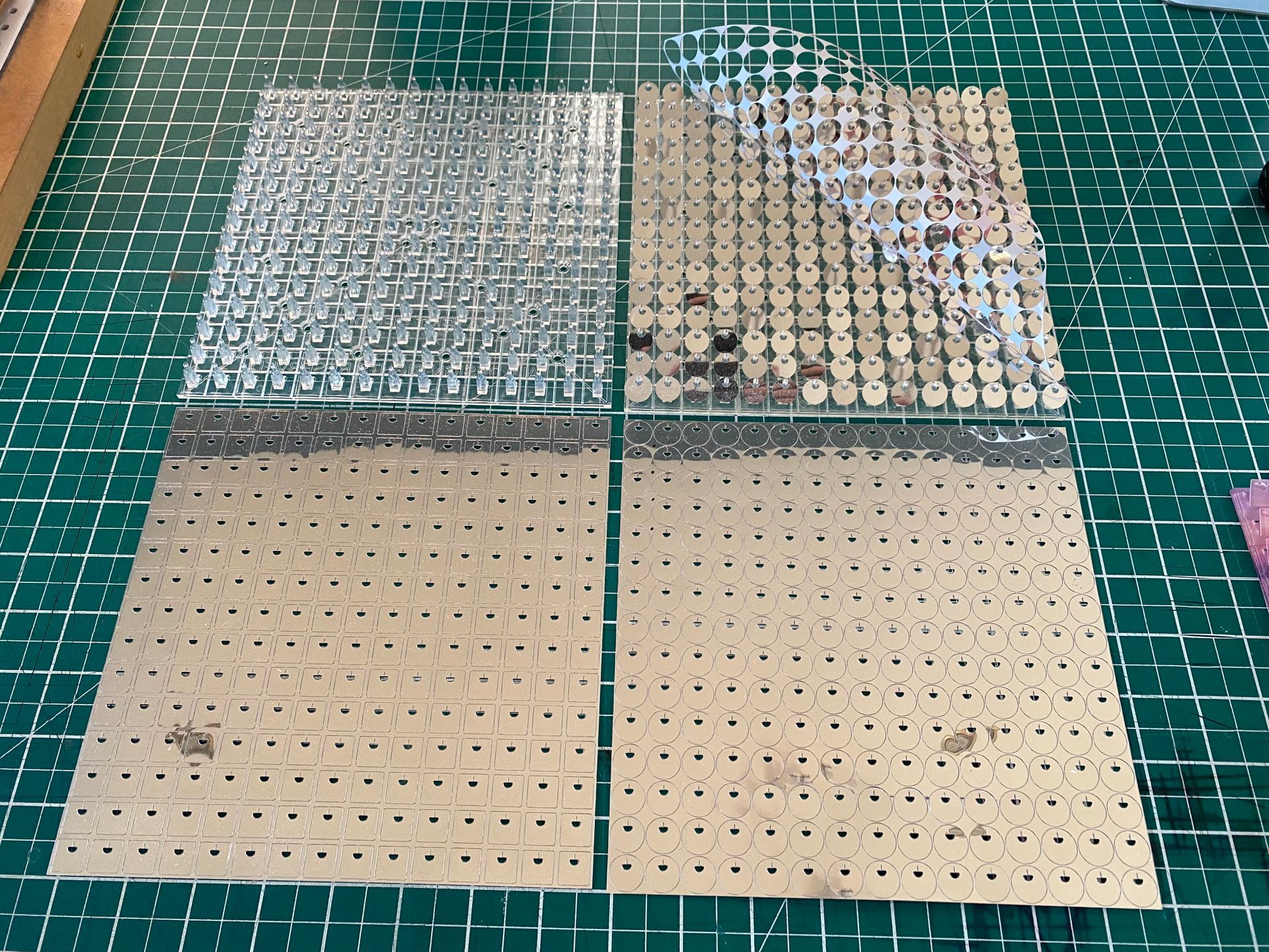 Das Modul ist optisch klar (200 x 200 mm). Zuerst drucken Sie das Bild spiegelverkehrt auf die Rückseite des Moduls und sichern es dann mit reinem Weiß. Als nächstes drucken Sie das gleiche Bild auf den Paillettenfolienträger. Wir haben zwei Arten von Paillettenträgern. Unsere erste ist die klassische Spiegelfolie und die zweite eine optisch klare Paillette. Warum? Nun, Metallic-Pailletten erzeugen ein sehr reflektierendes Ergebnis, das sich hervorragend für bestimmte Arten von Displays eignet. Die durchsichtigen Paillettenträger können entweder rückseitig bedruckt werden (was einen sehr hohen Glanz und ein qualitativ hochwertiges Ergebnis liefert), oder Sie können sie oberflächenbedrucken, was ein mattes Finish ergibt.