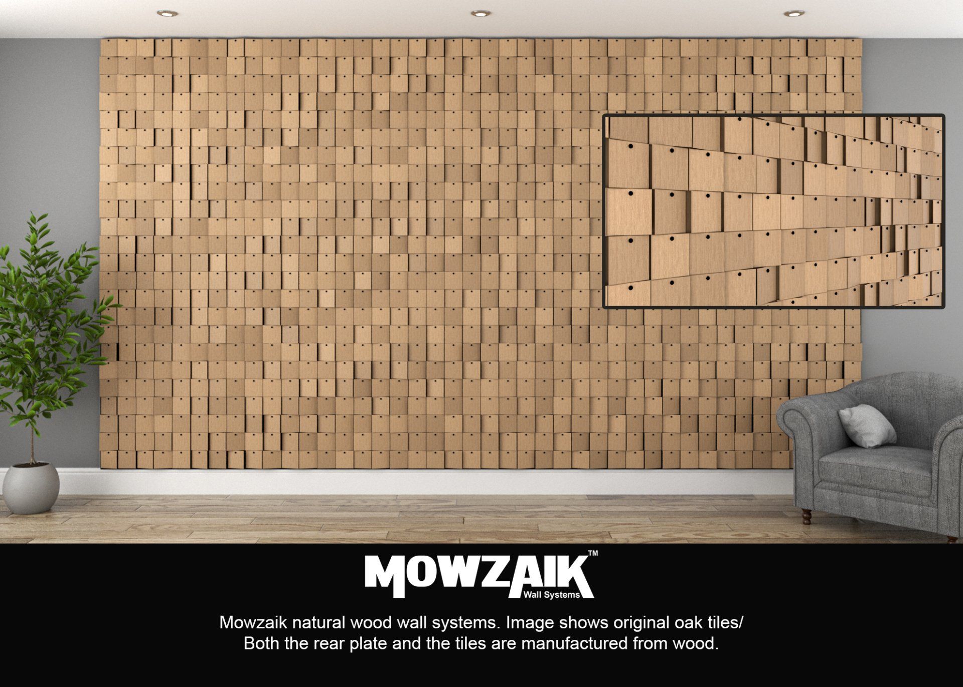 Mowzaik वॉल डिस्प्ले मॉड्यूलर हैं। प्रत्येक बैक प्लेट का माप 300 x 300 मिमी है जिसमें नौ (9) एनोडाइज्ड रिमूवेबल हैंगिंग पोस्ट हैं। प्रत्येक हैंगिंग पोस्ट में एक (1) फलक होता है जो 99 मिमी वर्ग का होता है। अनुरोध पर छोटी इनले टाइल्स का उत्पादन किया जा सकता है।